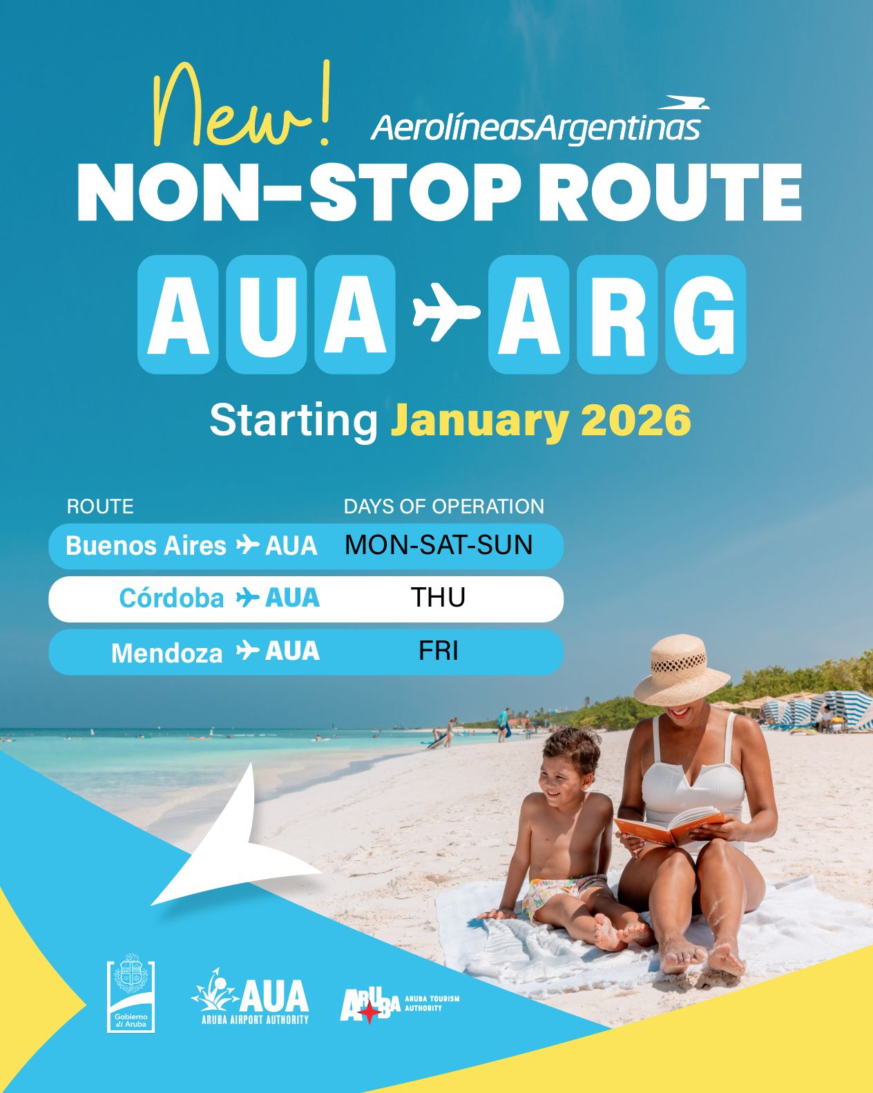 ORANJESTAD — Aerolíneas Argentinas start in januari 2026 met seizoensgebonden rechtstreekse vluchten van Argentinië naar Aruba. Dat maakten Aruba Airport Authority, de Aruba Tourism Authority (ATA) en het ministerie van Toerisme bekend.