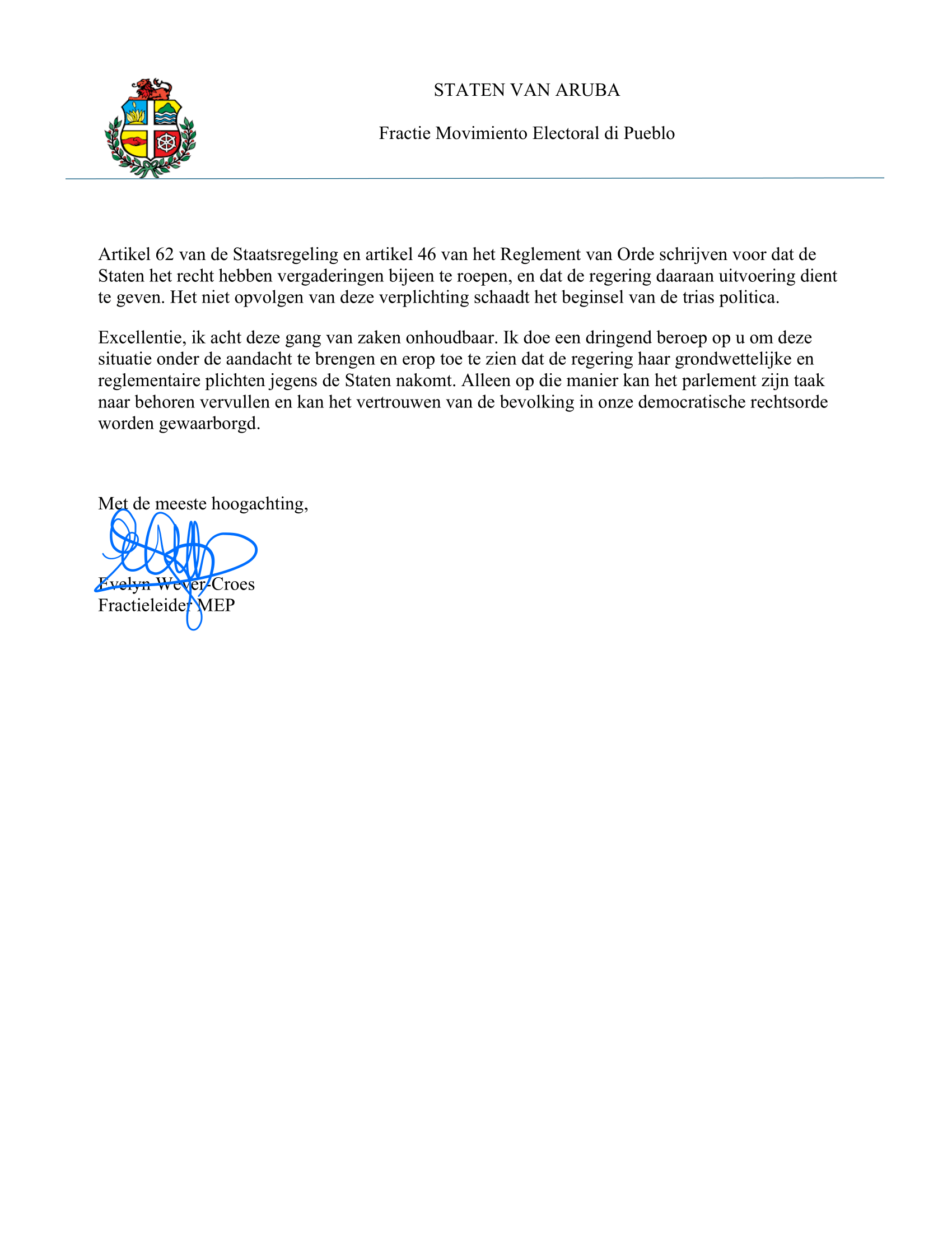 Wever-Croes wijst er daarnaast op dat ook verzoeken van de MEP-fractie om vergaderingen bijeen te roepen niet zijn ingewilligd. Volgens haar is dat in strijd met de Staatsregeling en het Reglement van Orde van het Parlement van Aruba.