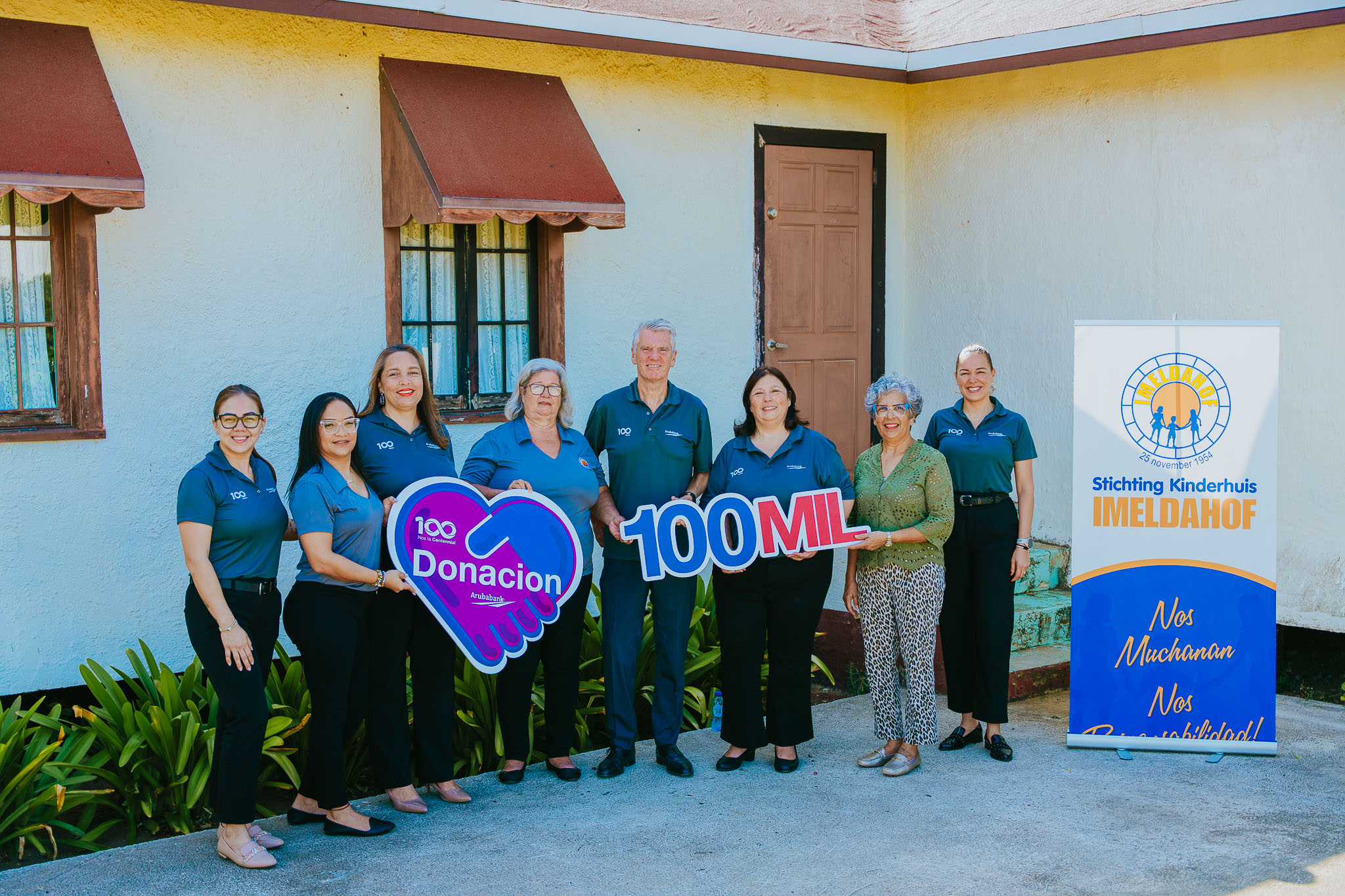 ORANJESTAD — Aruba Bank heeft vrijdag bekendgemaakt een donatie van 100.000 Arubaanse florin te doen aan Stichting Kinderhuis Imeldahof. De schenking maakt deel uit van het jubileumprogramma 100 Years Legacy Project, in het kader van het 100-jarig bestaan van de bank.