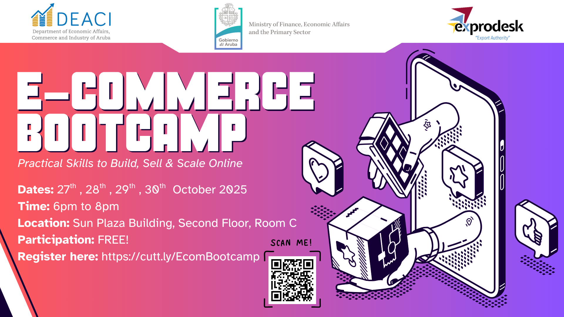 ORANJESTAD – Het Departamento di Asunto Economico, Comercio y Industria (DAECI) organiseert via zijn unit Exprodesk van 27 tot en met 30 oktober 2025 de vierdaagse workshop ‘E-Commerce Bootcamp: Practical Skills to Build, Sell & Scale Online’. De deelname is gratis.