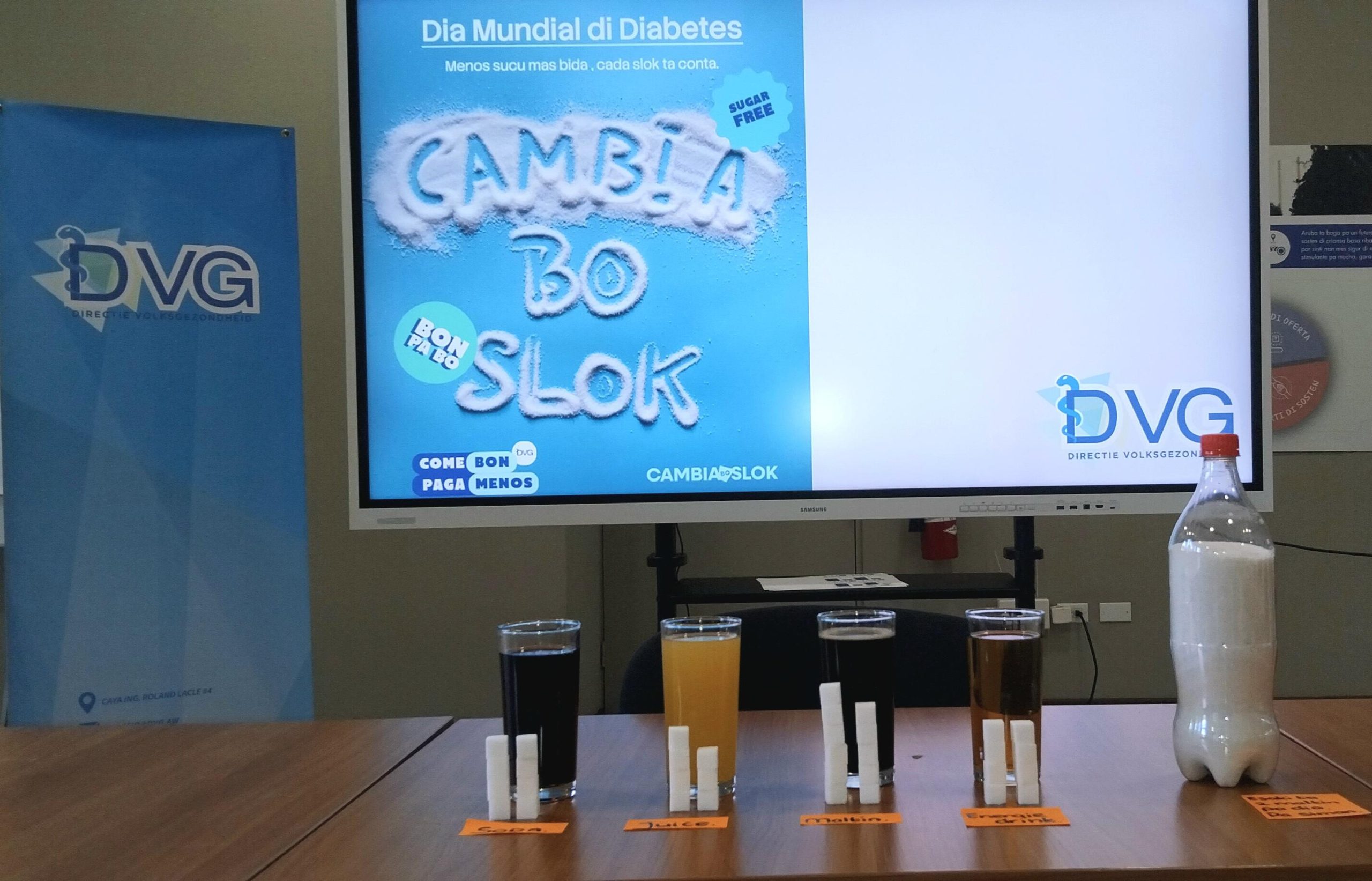 Het eerste campagnethema is Cambia bo Slok. In de periode van november tot en met januari richt DVG zich specifiek op het gebruik van dranken met een hoog suikergehalte. De centrale boodschap is dat consumenten eerst goed moeten nadenken voordat zij een suikerhoudende drank kiezen. In deze fase wordt informatie gegeven over het verband tussen zoete dranken en diabetes, en over gezondere en betaalbare alternatieven voor gezinnen.