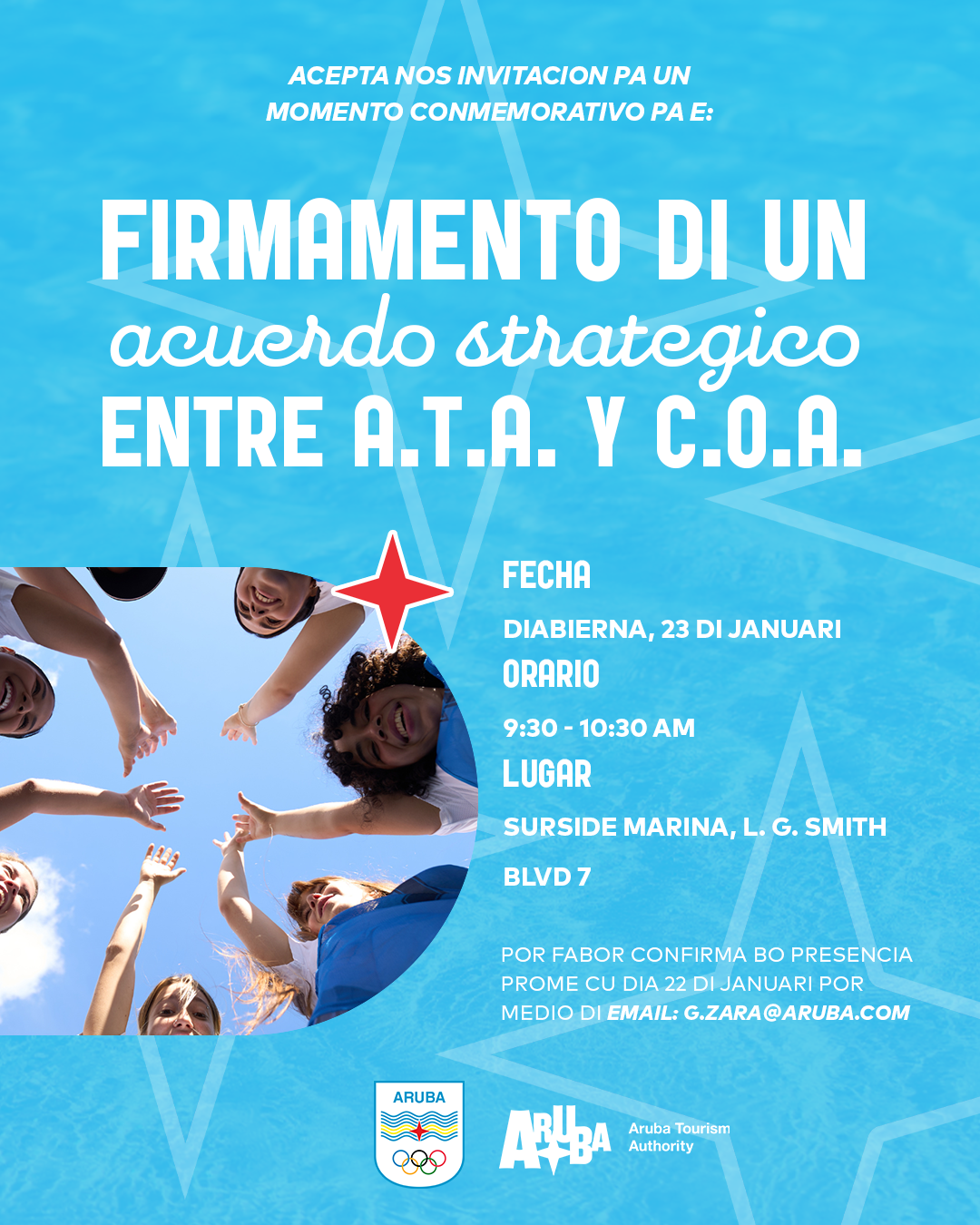 ORANJESTAD — De Aruba Tourism Authority (A.T.A.) en het Comité Olímpico Arubano (C.O.A.) ondertekenen vrijdag 23 januari een strategische samenwerkingsovereenkomst. De ondertekening vindt plaats bij Surfside Marina.