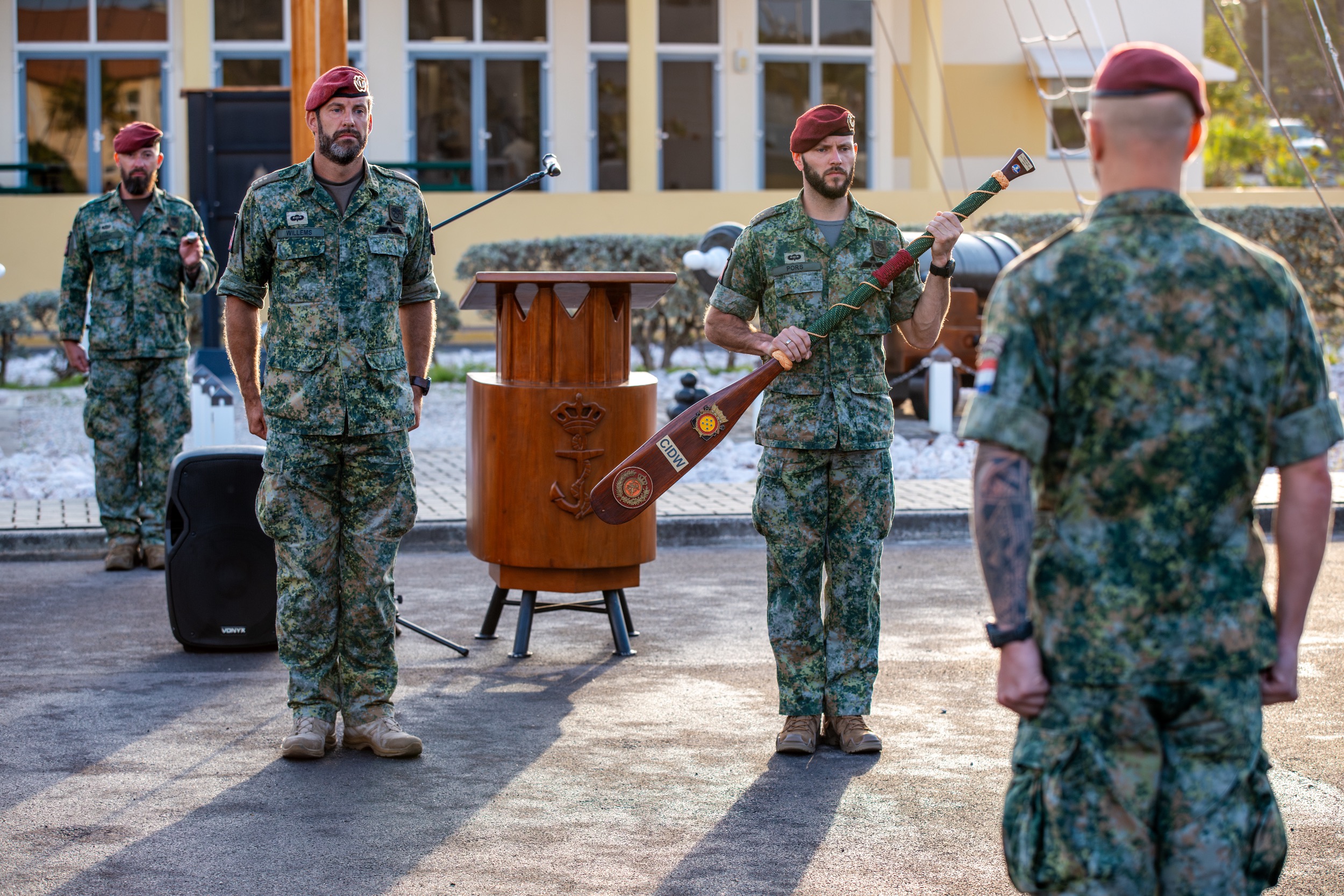 WILLEMSTAD — Tijdens een militaire ceremonie op maandag 2 maart heeft landmachtcompagnie rotatie 50 haar taken in het Caribisch gebied overgedragen aan rotatie 51. Bij de traditionele peddeloverdracht nam kapitein Marnix het commando over van kapitein Roderik.