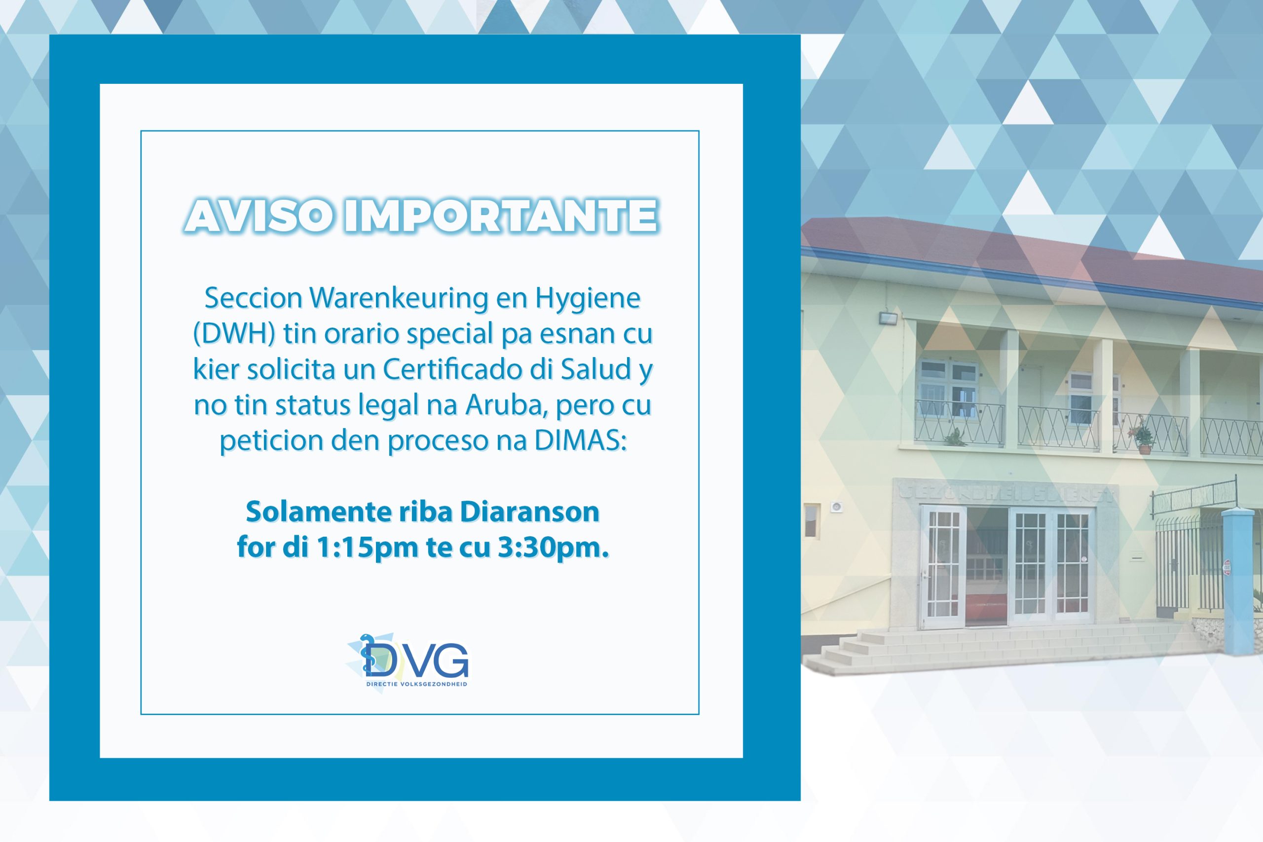 ORANJESTAD — De Directie Volksgezondheid (DVG) heeft via de afdeling Warenkeuring en Hygiëne (DWH) een speciaal spreekuur ingesteld voor personen die een gezondheidsverklaring, ook bekend als de groene kaart, aanvragen terwijl zij geen legale status in Aruba hebben en hun aanvraag nog in behandeling is bij DIMAS.