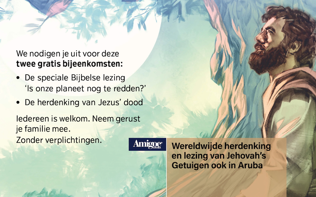 ORANJESTAD – Jehovah’s Getuigen organiseren eind maart en begin april twee openbare religieuze bijeenkomsten in Aruba, in het kader van een wereldwijde uitnodigingsactie. Het betreft een speciale lezing over de toekomst van de aarde en de jaarlijkse herdenking van de dood van Jezus Christus.