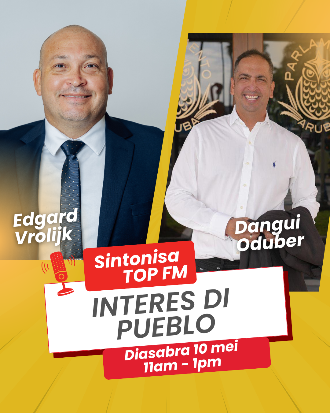 ORANJESTAD — Parlementariërs Edgard Vrolijk en Dangui Oduber van MEP zijn zaterdag 10 mei te horen in het radioprogramma Interes di Pueblo. Dat heeft de partij in een persbericht bekendgemaakt.