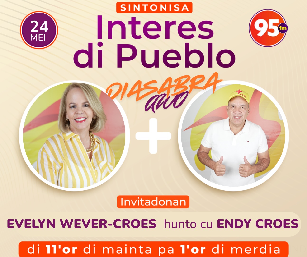 ORANJESTAD — MEP-parlementariërs Evelyn Wever-Croes en Endy Croes zijn zaterdag 24 mei te gast in het radioprogramma Interes di Pueblo op Top FM 95.1. Het programma, gepresenteerd door Joe Koolman, wordt iedere zaterdag uitgezonden van 11.00 tot 13.00 uur en staat in het teken van actuele onderwerpen.