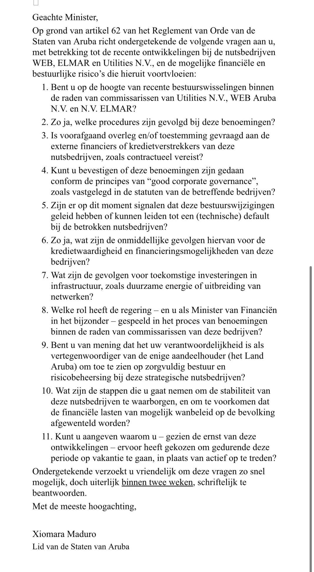 In haar brief benadrukt Maduro de verantwoordelijkheid van de regering en in het bijzonder van het ministerie van Financiën als eigenaar en enig aandeelhouder om zorgvuldig bestuur en verantwoord beheer bij deze vitale overheidsbedrijven te waarborgen.
