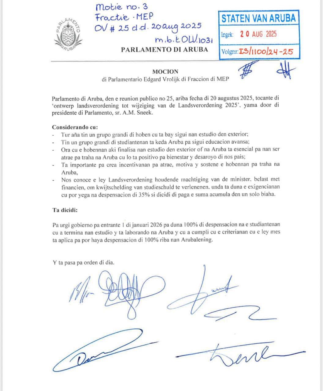 ORANJESTAD — Tijdens de behandeling van de suppletoire begroting vorige week heeft de MEP-fractie een motie ingediend om studenten met een Arubalening kwijtschelding te verlenen. Het voorstel hield in dat studenten die na hun studie terugkeren naar Aruba om te werken, hun lening niet zouden hoeven terug te betalen.