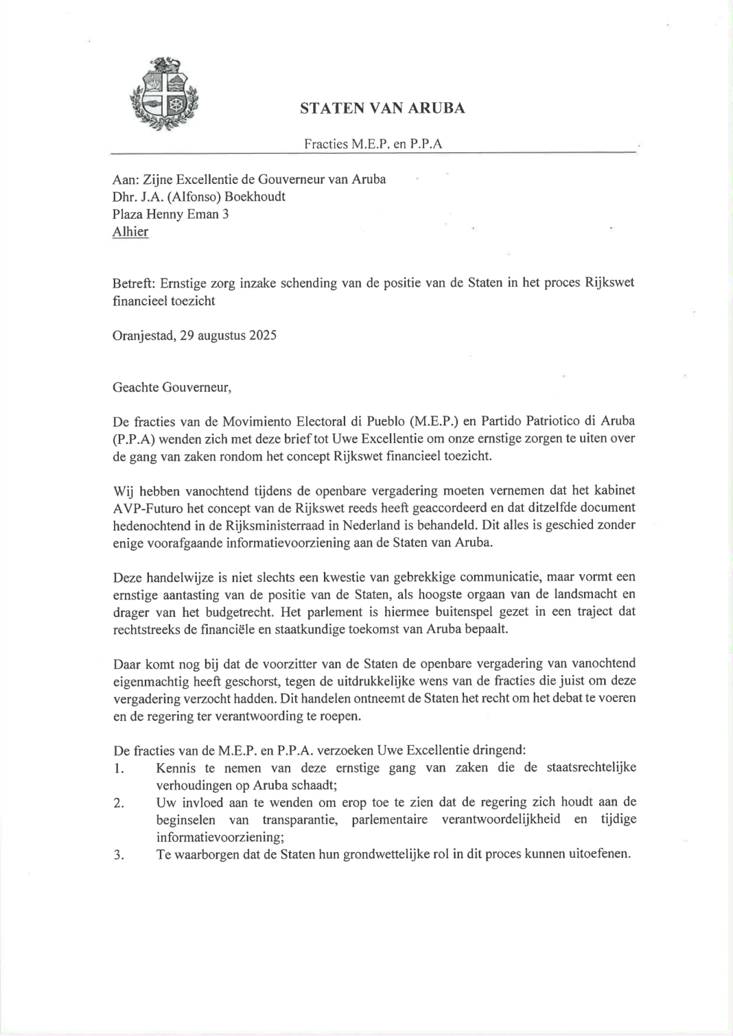 MEP en PPA hebben inmiddels een brief overhandigd aan het Kabinet van de Gouverneur, met het verzoek om tussenkomst ter bescherming van de democratie op Aruba.