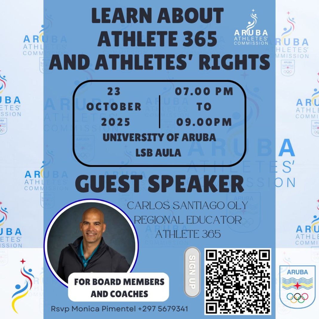 ORANJESTAD — Het Aruba Athletes Commission (AAC) organiseert samen met het Comité Olímpico Arubano (COA) op donderdag 23 oktober 2025 een informatieve avond voor lokale sportfederaties, bestuurders en trainers. Centrale gast is Carlos Santiago OLY, olympisch atleet en momenteel educator van Athlete365.