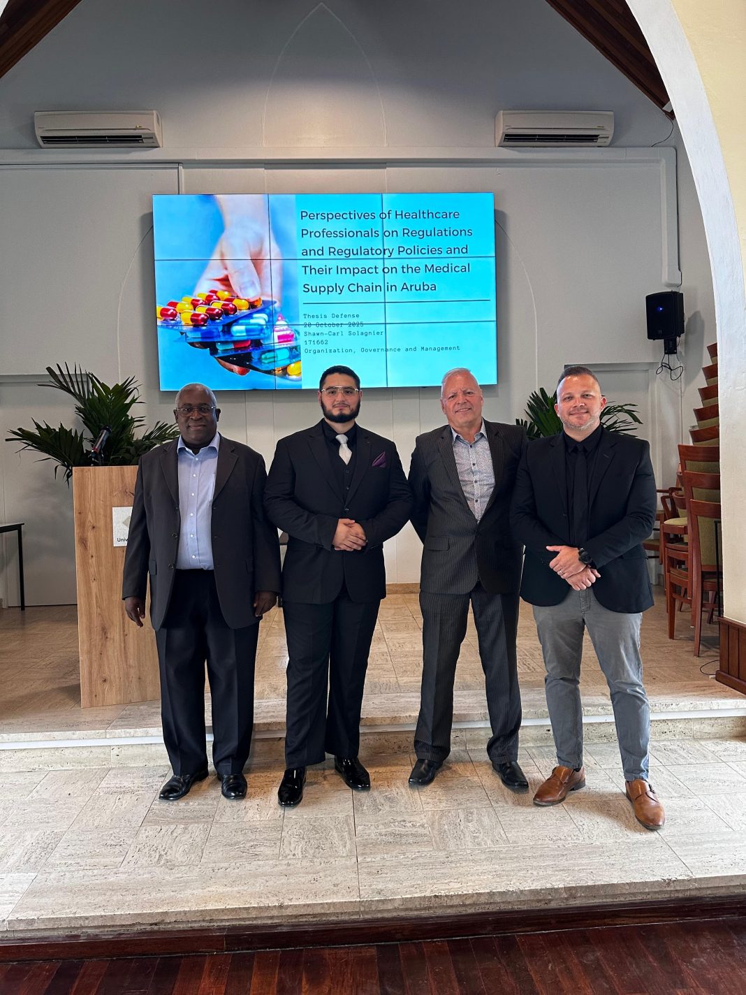 Zijn scriptie, getiteld “Perspectives of Healthcare Professionals on Regulations and Regulatory Policies and Their Impact on the Medical Supply Chain in Aruba”, werd verdedigd tegenover een afstudeercommissie bestaande uit Helmut Vink, LL.M., MA, Luciano Milliard, LL.M., en Clayton Croes, MSc. Bij de verdediging waren ook OGM-programmamanager Ahmet Talan, MSc, familieleden, vrienden, docenten van de Universiteit van Aruba en medestudenten aanwezig.