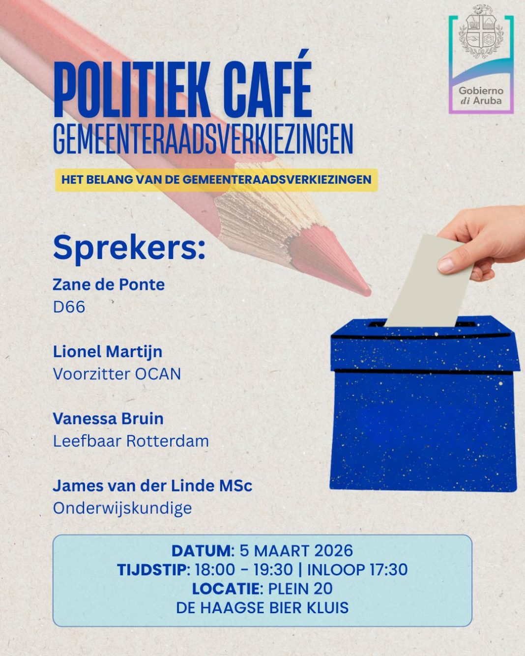 DEN HAAG — Het Kabinet van de Gevolmachtigde Minister van Aruba organiseert op donderdag 5 maart 2026 een Politiek Café in het kader van de komende gemeenteraadsverkiezingen in Nederland. Met de bijeenkomst wil het kabinet Arubanen die in Nederland wonen informeren over het belang van stemmen en de betekenis van gemeentepolitiek.