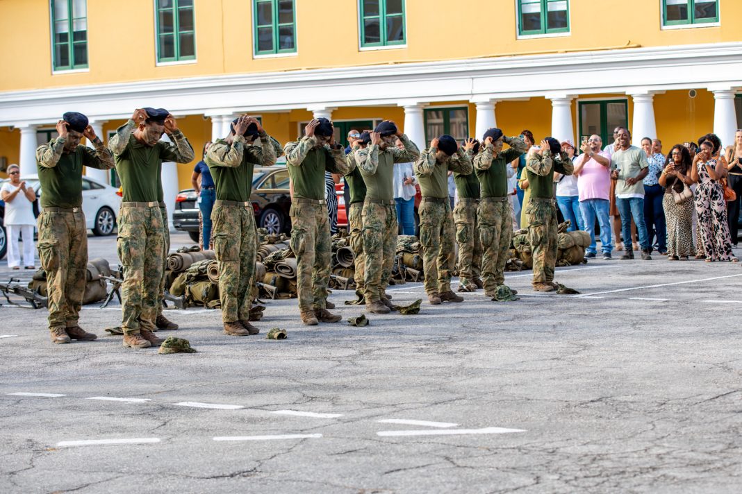 WILLEMSTAD — Dertien deelnemers van de Eerste Militaire Vorming (EMV) hebben vrijdagochtend 6 maart op Fort Amsterdam in Willemstad hun operationele militaire baret ontvangen. De ceremonie volgde op de traditionele afsluiting van de opleiding met een eindmars van 25 kilometer, die in de nacht van donderdag op vrijdag werd afgelegd.