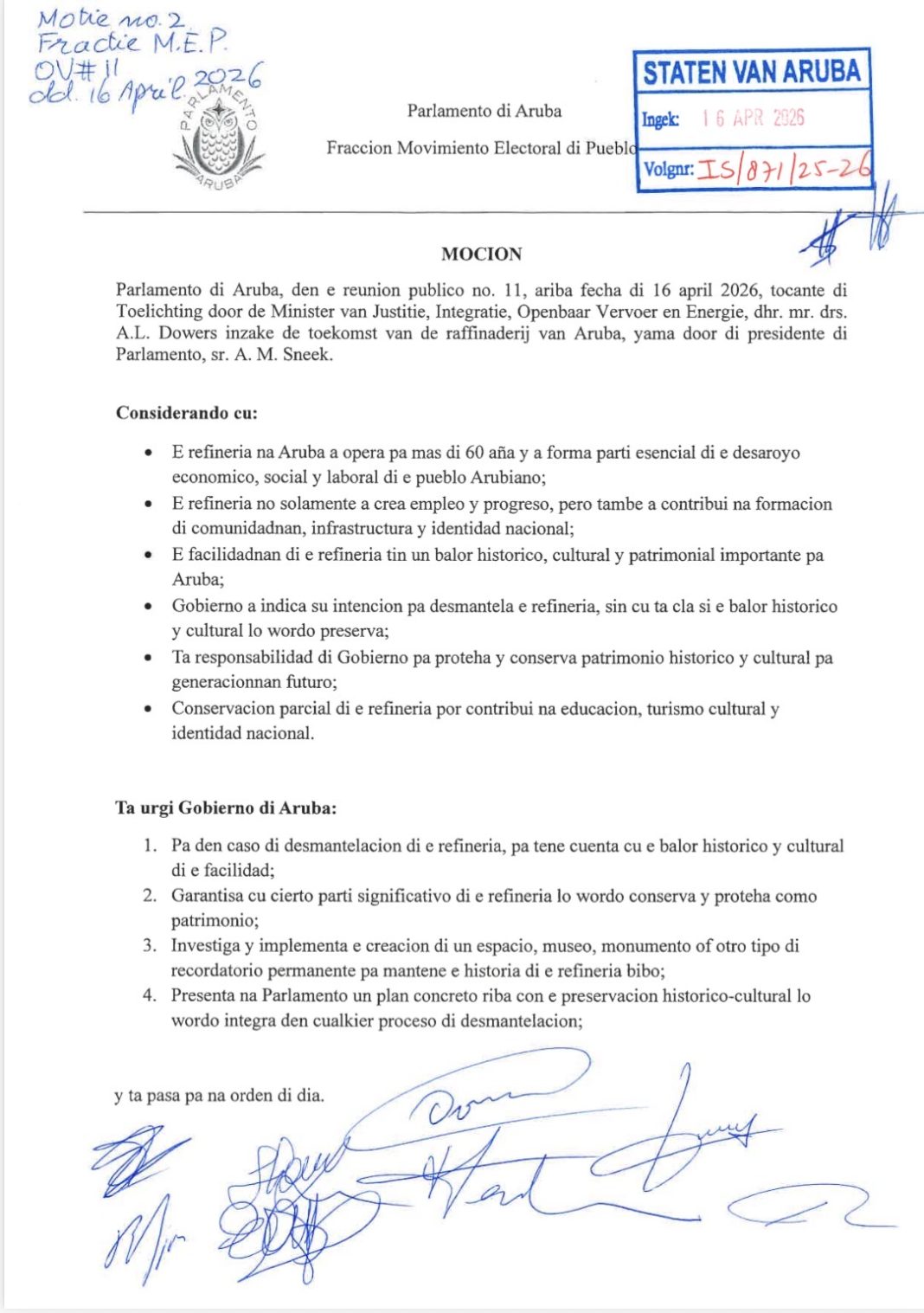 De MEP-fractie stelt met de motie haar inzet te willen bevestigen om de geschiedenis van de raffinaderij levend te houden, zodat jonge generaties beter begrijpen hoe Aruba zich economisch en maatschappelijk heeft ontwikkeld.