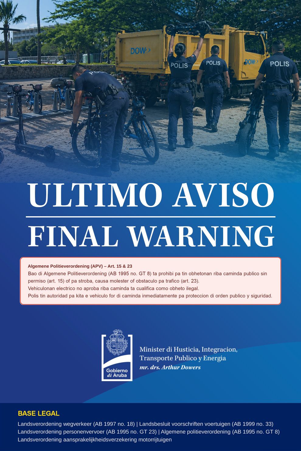 Oranjestad — De Arubaanse overheid heeft een definitieve waarschuwing gegeven aan gebruikers en aanbieders van elektrische steps, e-bikes en scooters die zich illegaal op de openbare weg bevinden. In een officiële mededeling onder de titel “Ultimo Aviso / Final Warning” benadrukt het Ministerie van Justitie, Integratie, Transport Publiek en Energie de noodzaak om de Algemene Politieverordening na te leven. Voertuigen die zonder toestemming op de openbare weg staan of het verkeer hinderen, kunnen door de politie onmiddellijk worden verwijderd.