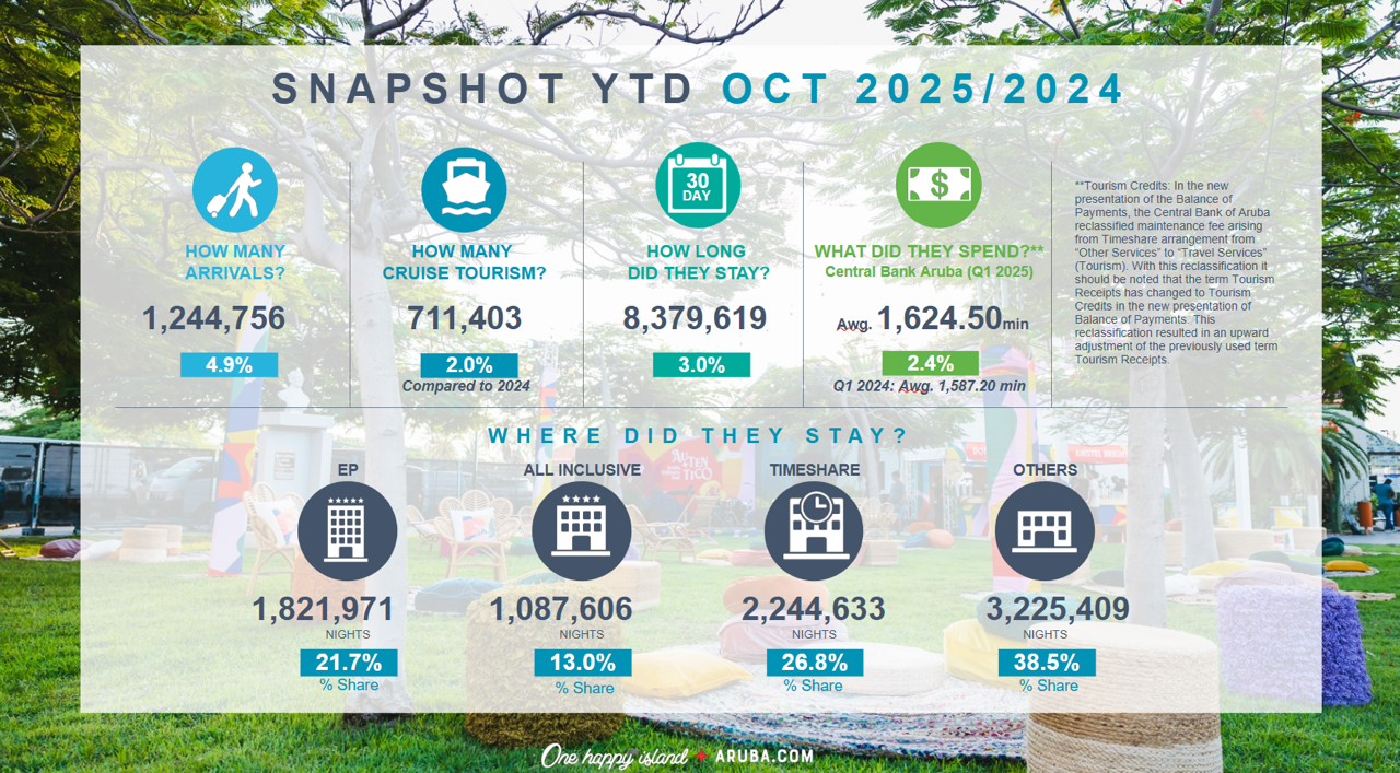 Volgens het maandelijkse statistiekrapport van de Aruba Tourism Authority (A.T.A.) weerspiegelt de sterke groei uit Noord-Amerika de aanhoudende vraag naar Aruba als tropische bestemming. Voor Latijns-Amerika blijven Argentinië en Brazilië een belangrijke motor achter de groei in aankomsten voor de maand oktober. Europa laat een stabiel niveau zien zonder significante veranderingen.