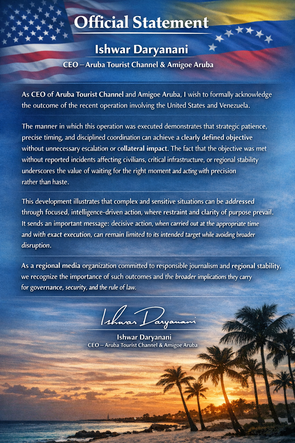 Als CEO van Aruba Tourist Channel en Amigoe Aruba wens ik formeel kennis te nemen van de uitkomst van de recente operatie waarbij de Verenigde Staten en Venezuela betrokken waren.