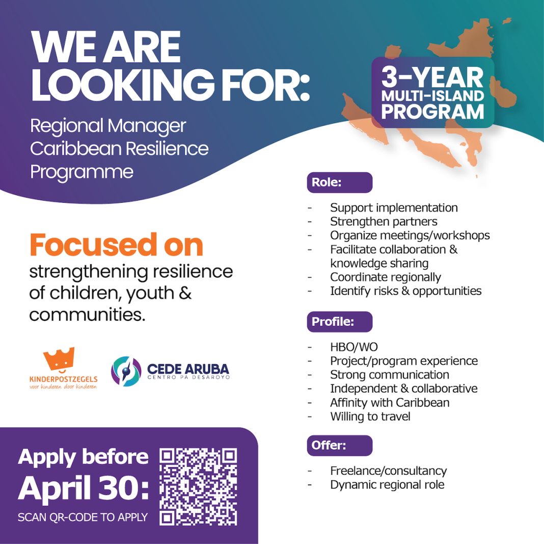 Een samenwerkingsverband van onder meer Kinderpostzegels Nederland en CEDE Aruba heeft een vacature opengesteld voor de functie van Regional Manager Caribbean Resilience Programme. Het betreft een meerjarig programma van drie jaar, gericht op het versterken van de veerkracht van kinderen, jongeren en gemeenschappen binnen het Caribisch gebied.
