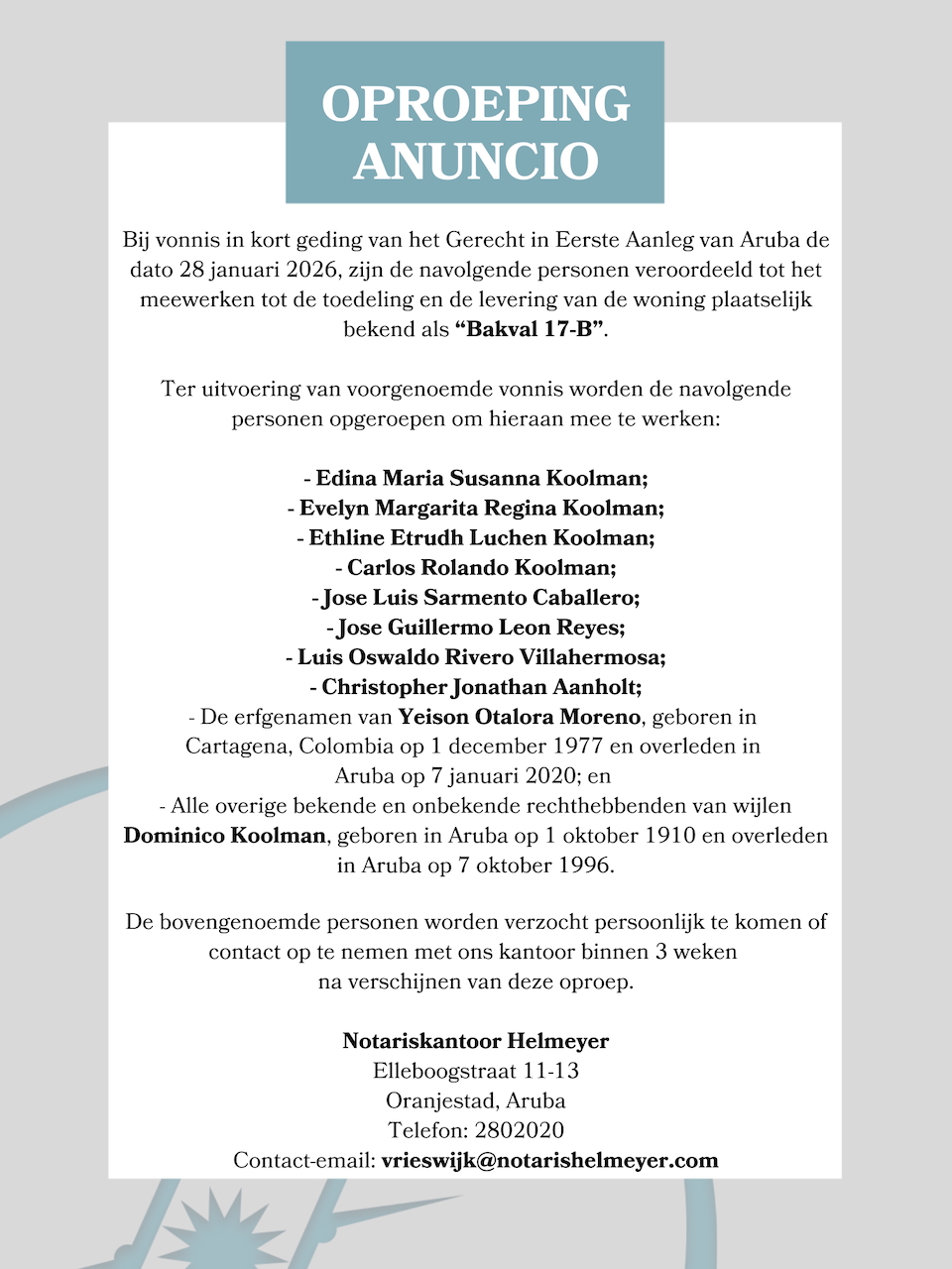 Op basis van een vonnis in kort geding van het Gerecht in Eerste Aanleg van Aruba van 28 januari 2026 zijn meerdere personen opgeroepen om mee te werken aan de toedeling en levering van een woning, bekend als “Bakval 17-B”. De oproep is gepubliceerd door een notariskantoor in Oranjestad.
