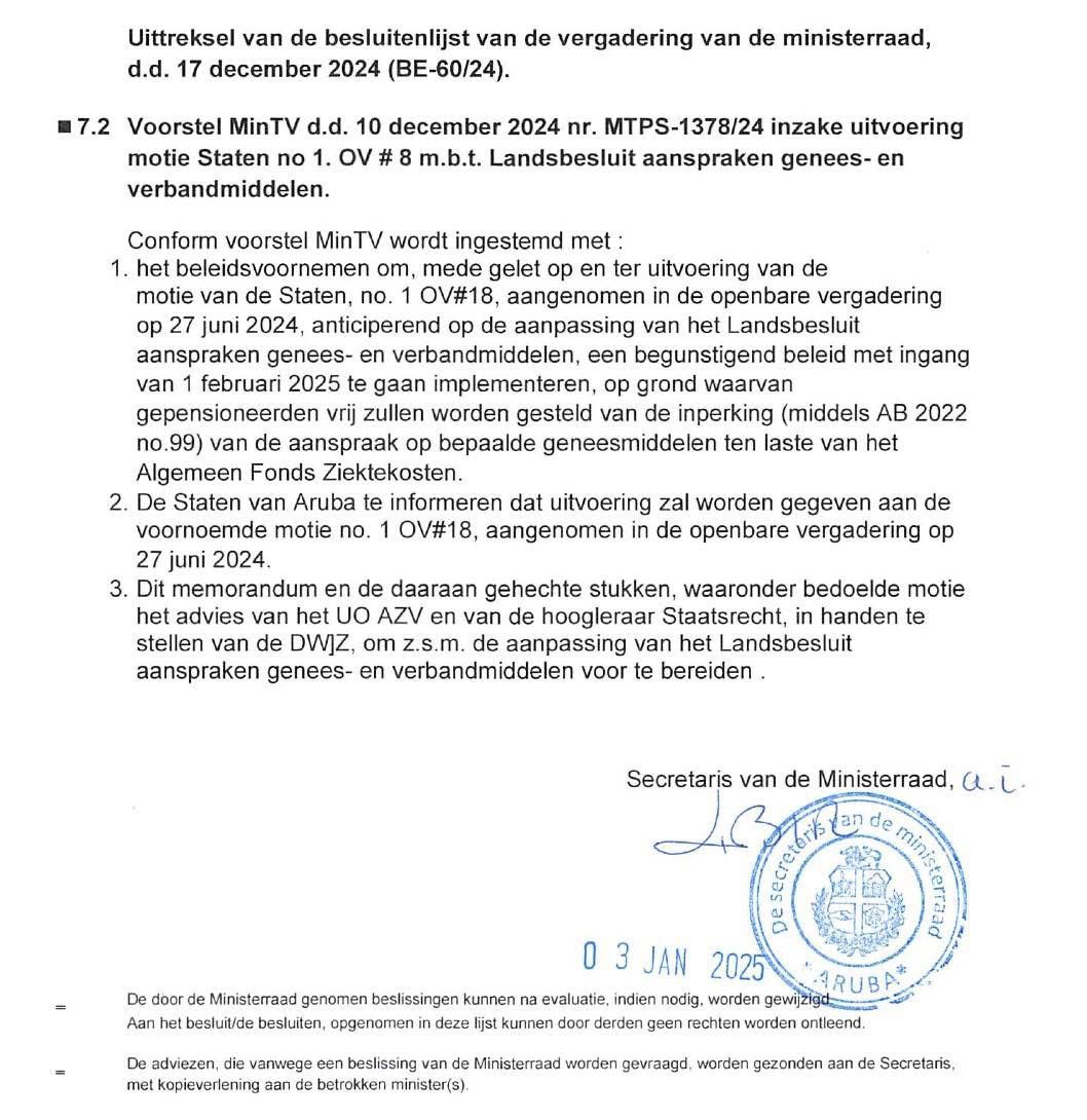 Eind 2024 werd het kabinet-Wever-Croes door AZV geïnformeerd dat er sprake was van een overschot. Op basis daarvan nam de ministerraad destijds het besluit om de medicijnen voor pensionado’s terug te geven, aldus Wever-Croes.