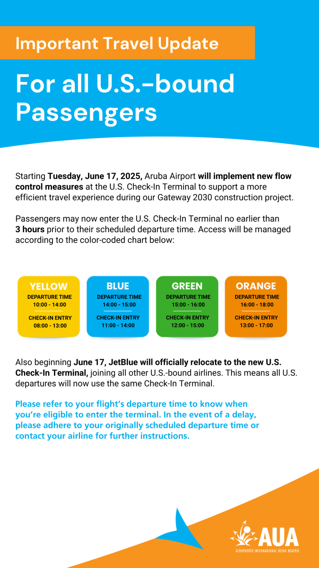 ORANJESTAD — Aruba Airport Authority (AAA) voert vanaf dinsdag 17 juni 2025 een nieuw systeem voor passagiersstromen in voor alle vertrekkende vluchten naar de Verenigde Staten. Met de maatregel wil de luchthaven de doorstroming verbeteren en drukte beperken tijdens de lopende bouwwerkzaamheden in het kader van het project Gateway 2030.