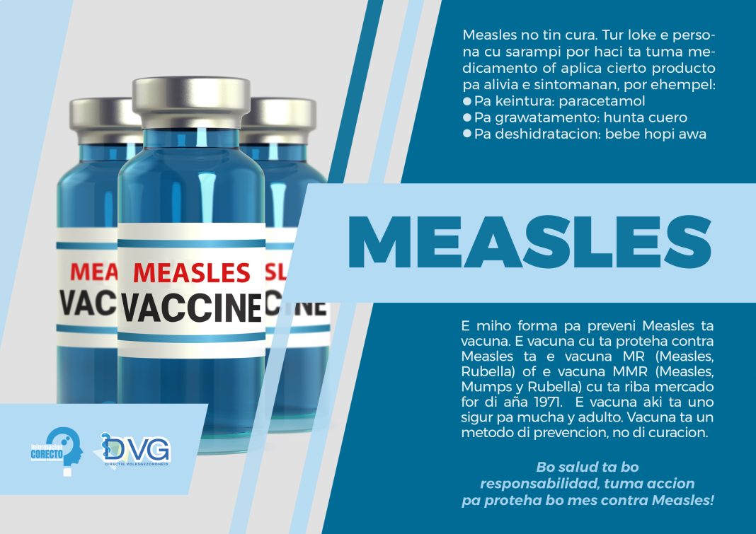 ORANJESTAD — Mazelen, op Aruba beter bekend als sarampi, is een ziekte die wordt veroorzaakt door een virus. Omdat het om een virusinfectie gaat, bestaat er geen specifiek geneesmiddel om de ziekte te genezen. De Directie Volksgezondheid (DVG) laat weten dat het lichaam zelf het virus moet bestrijden en dat dit tijd kost.