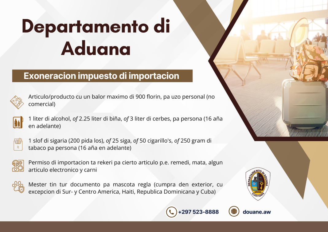 ORANJESTAD – Nu het vakantieseizoen is aangebroken, roept de Douane reizigers op zich goed voor te bereiden op hun vertrek en terugkeer. Met duidelijke informatie over vrijstellingen en invoerregels wil de dienst bijdragen aan een vlotte en zorgeloze reis.