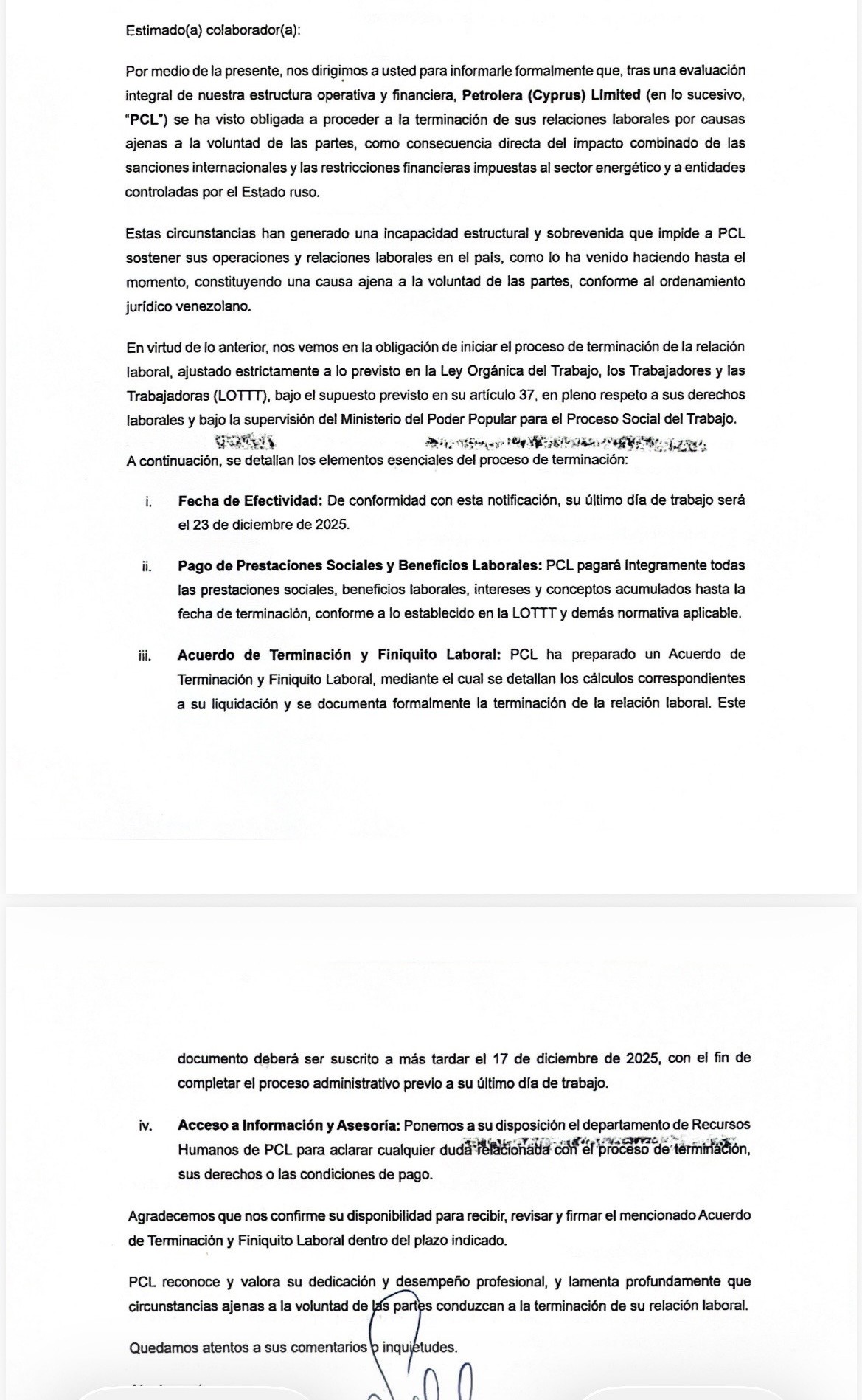 De brief vermeldt concreet dat 23 december 2025 de laatste werkdag zal zijn voor de medewerkers. Daarna zal PCL overgaan tot de volledige uitbetaling van sociale voorzieningen, arbeidsvoordelen, rente en andere opgebouwde rechten, zoals vastgelegd in de Venezolaanse arbeidswetgeving. Tevens wordt verwezen naar een afzonderlijk akkoord voor beëindiging en arbeidsfinaalafrekening, waarin de exacte berekeningen van de uitkeringen zijn opgenomen en dat door de werknemers moet worden ondertekend.
